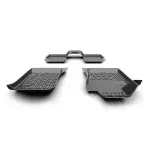 - Description: These all-weather floor mats are a robust design made to completely cover the foot well areas in the front and second rows. Available in Black with two front row mats and two second row interlocking mats. All mats feature the Jeep logo.